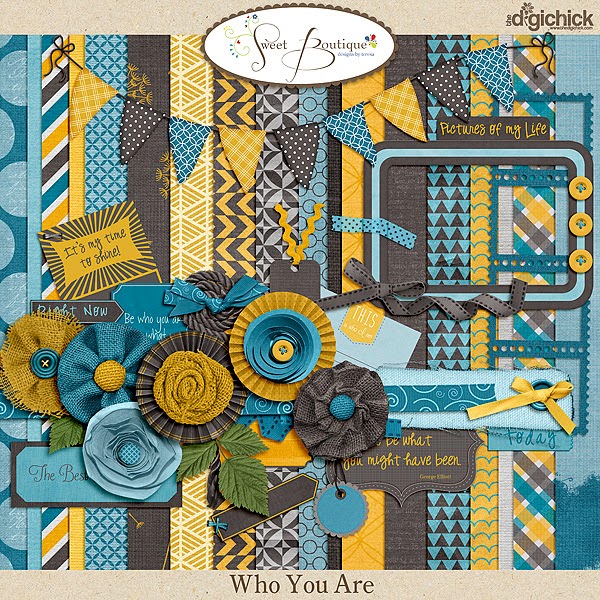 Here is the second kit I am releasing this weekend. Who You Are is a kit to showcase someone's special personality or ability and let them know that it is important to just be who you are. It is also a kit to show encouragement to someone who had changed the path of their life by changing jobs or going back to school. There are 2 word art quotes that express those sentiments. I love the colors of this kit and think that they work great with male or female pages.